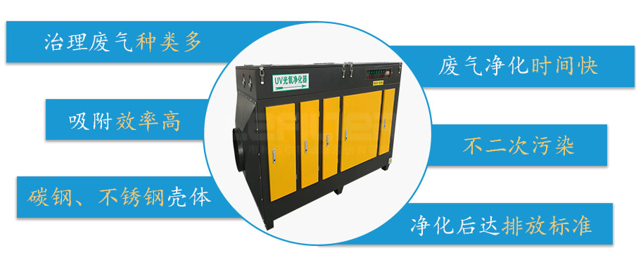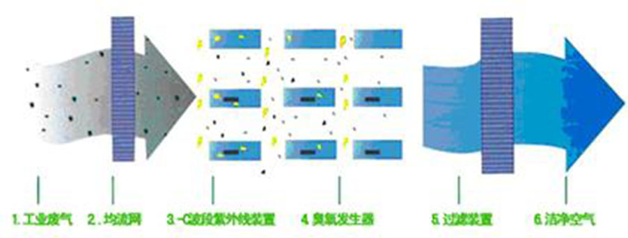 分解后的小分子基團在特定頻率的光和光觸媒的催化下與空氣中的氧發生氧化反應生成無毒無害的小分子物質;同時,空氣量的氧也在紫外光照射的催化下反應成臭氧,臭氧分子具有強氧化性,可將油煙廢氣中被分解后中分子基因氧化,生成無臭無害的小分子物質,從而使異味大大衰減或者完全消失。
