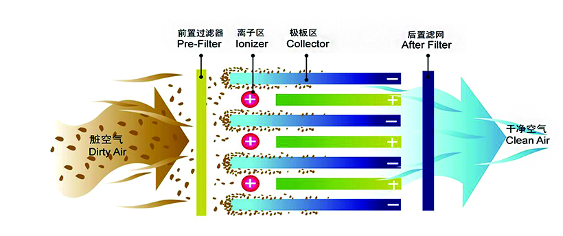 極板式油煙凈化器是利用高壓發生器續穩定輸高壓,高壓載體極板式電場所應用的靜電除煙技術是利用陰極板在高壓電場中放射出來電子,以及由電子碰撞空氣分子而產生負離子來捕捉油煙、油霧粒子,使其粒子帶,在通過高壓電場產生庫倫力,使帶電粒子被陽極吸附,以達清除目的,由于電子直徑比較小,其徑比油煙及油霧粒子的徑小很多數量級,而且電場中電子密度很高,可以說無處不處在電場中的煙塵粒子很容易被荷電捕捉。煙塵粒子在電場中的荷電是循環包括電場荷電和擴散荷電等機理的必然現象,而不是簡單的偶爾碰撞引起的, 帶電粒子在電場中會受到庫倫力的作用,使其結果是煙塵粒子被吸附到陽極上,因此靜電除油煙效率很高,而且特別適用于與捕捉徑粒較小和重量較輕的煙塵粒子,極板式油煙凈化設備的電能主要用來放射電子和推動煙塵粒子,其設計決定電場與空氣不產生機械力作用,因而靜電場的能耗較小,阻力也較小,無需使用較大壓力風機牽引,總能耗相比其他除油方式要小。